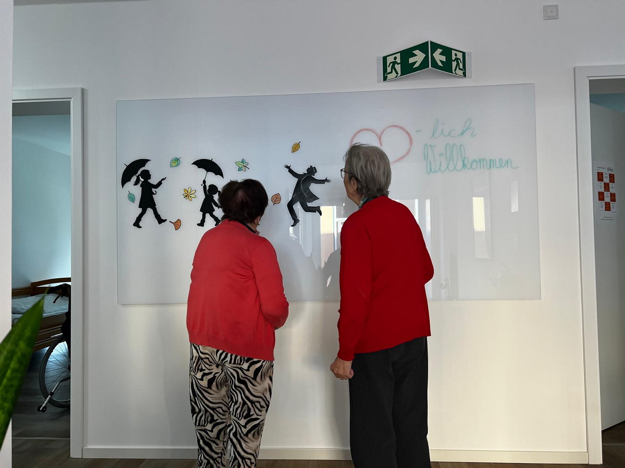 Am Krossinsee ist der Herbst eingezogen und so haben wir auch unsere Wandtafel in den Räumlichkeiten unserer Tagespflege herbstlich geschmückt. In Gemeinschaftsarbeit gestalteten wir ein Silhouettenbild. Die Fingerfertigkeit wurde mit Ausschneiden, Malen mit Tusche und Anbringen an die Tafel gefördert.