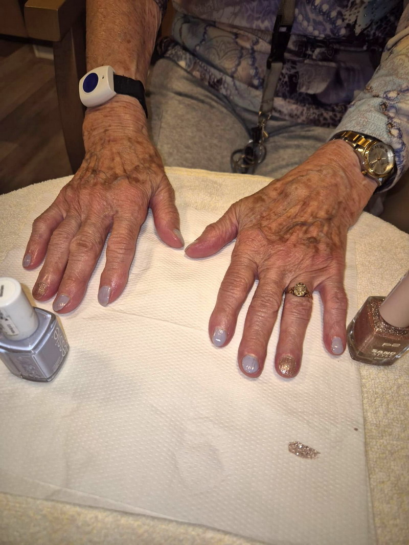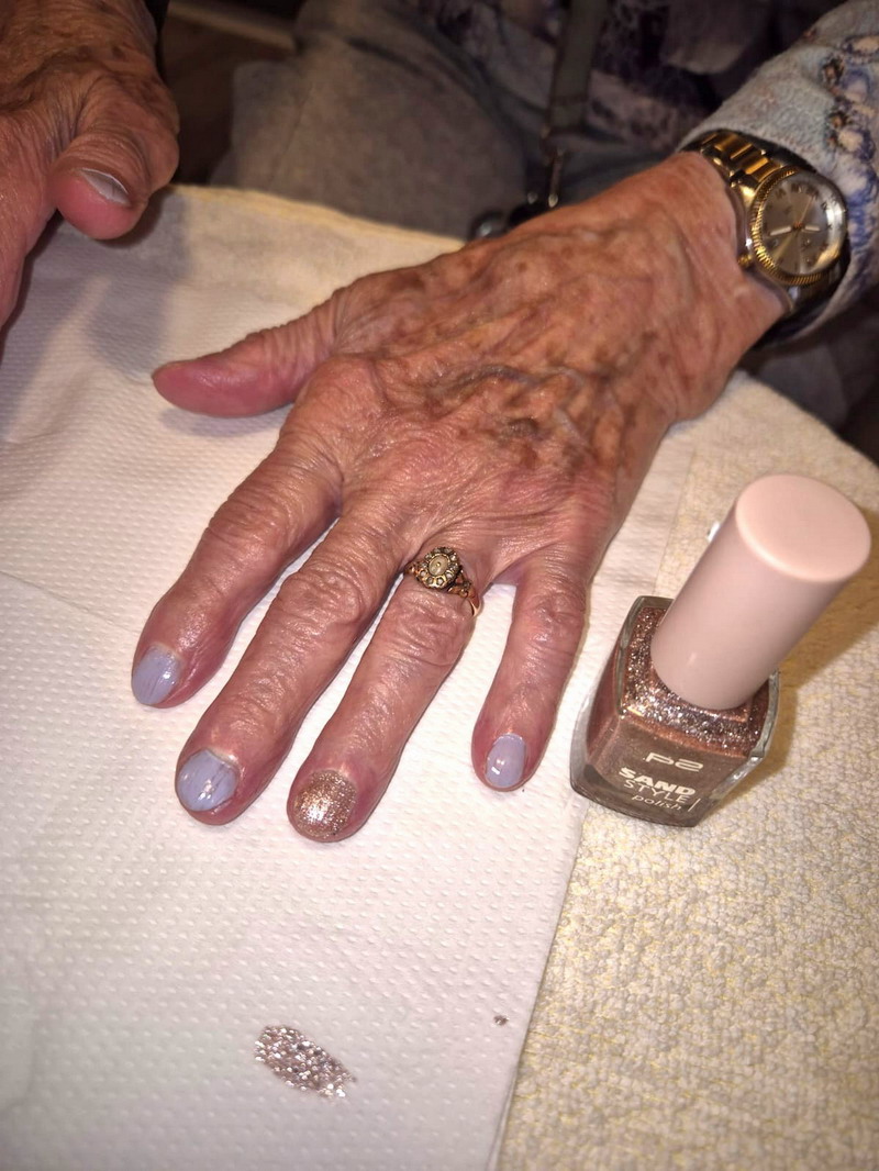 Heute stand Maniküre auf unserem Plan. Erst durften die Gäste ein warmes Handbad machen und dann probierten wir verschiedene Nagellackfarben aus. „So schön waren ja meine Fingernägel schon lange nicht mehr“, sagte Frau Z., 91 Jahre.